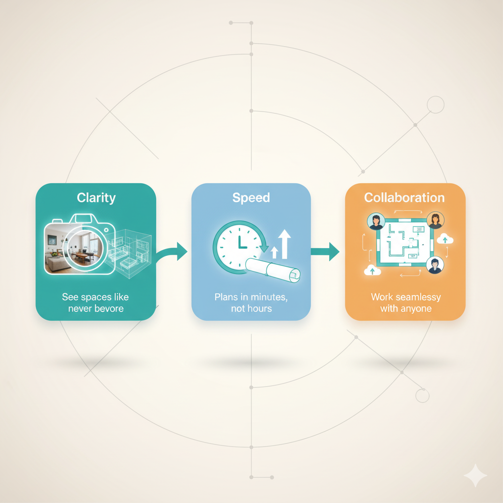 Transform raw interior photos into structured, editable floorplans with AI-powered recognition and export to professional tools like AutoCAD, Revit, and SketchUp.